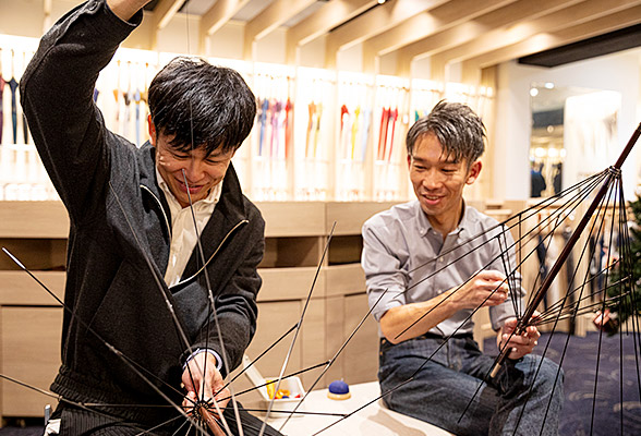 傍で真剣に作業を見つめていた三菱電機ホーム機器・内田龍一も、「ろくろ付け」を体験させていただきました。ショールームに移動し、指貫をつけて作業開始です。マンツーマンで教えてもらいながらの作業ですが、実は「ろくろ付け」は傘づくりの中でも難関と言われる工程だそうです。