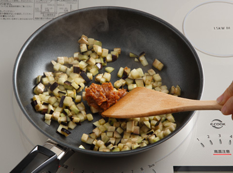 なすを入れて1分ほど炒め、味噌を加えて炒め合わせる。