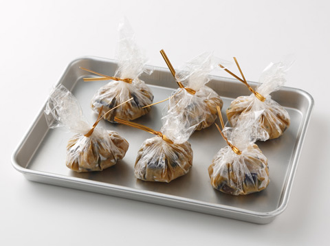 なす味噌を6等分し、ラップに包んで茶巾に絞り、冷凍する。