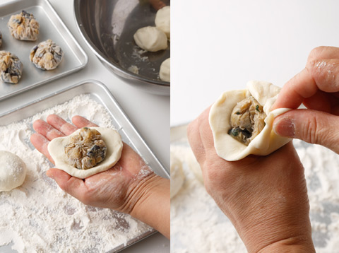 なす味噌1個を生地の中央にのせ、周囲の生地をのばしながら包む。