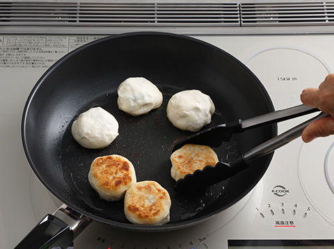 おやきの余分な粉をはらい落として並べ入れ、【火力5】にして両面に焼き色をつける。 -