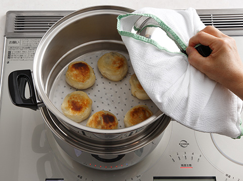 クッキングシートを敷いた蒸し器の上鍋におやきを並べ、乾いた布巾をかませて蓋をする。