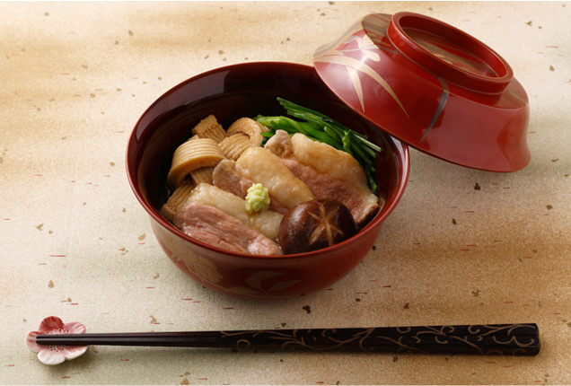 治部椀と呼ばれる漆器は、とろみのついた汁をいただきやすく、美しく盛り付けられるよう、広口で浅い作りになっています。