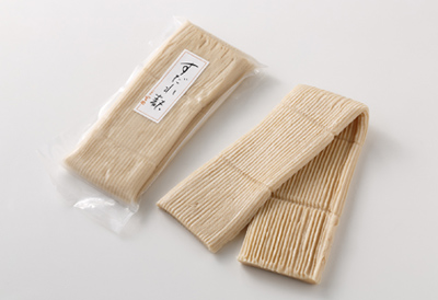 すだれ麩は熱湯で2~3分ゆで、長さを半分に切って縦4等分に切り、軽く結ぶ。