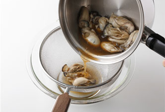 ざるでこし、かきと煮汁に分ける。- ※かきは火を通しすぎると身が縮み、かたくなりますが、火の通りが不十分では甘みや旨みが引き出されません。この段階で白っぽくぷっくりと膨らむまで火を通しましょう。