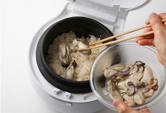 鍋に調味料を入れて【火力8】でひと煮立ちさせ、かきを加えて軽く混ぜながら食べごろになるまで火を通す。