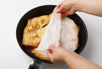 麺棒などで押して水気を絞り、キッチンペーパーで両面を強く押して水分と油分を吸わせる。