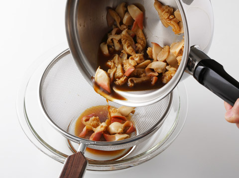 混ぜながら火を通し、足がピンク色に変わったらざるでこし、貝と煮汁に分ける。 -