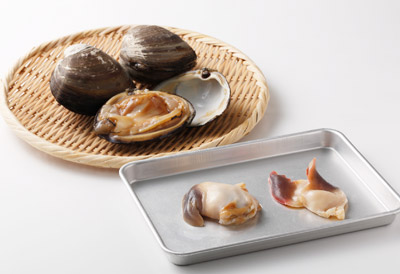 ほっき貝は殻をむき、ワタなどを除いて足(中央にある舌状の身)とヒモ、貝柱に分ける。