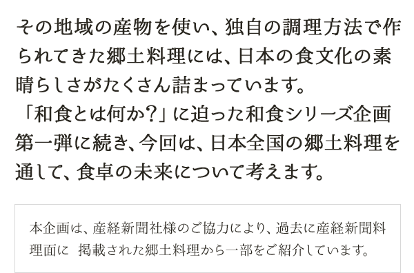地域の食材を活かし、自然への感謝の気持ちと共に育まれてきた郷土料理は、和食文化を再生させていくためのひとつの鍵になると、私は考えています。郷土料理を知ることが、家庭の食卓を見つめ直すきっかけになることを期待したいですね。