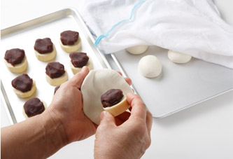 生地をかぶせて裏返し、周囲の生地をのばしながら包む。