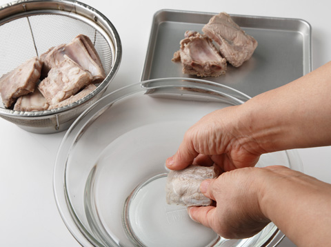 豚肉をぬるま湯にとり、アクなどを洗い流す。