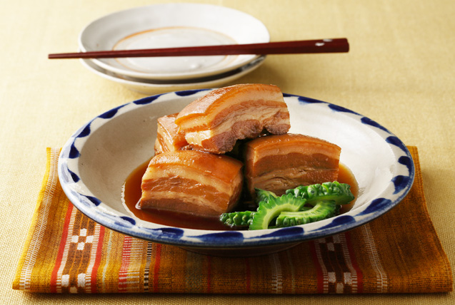 皮つき豚バラ肉を、箸でちぎれるほどやわらかく煮込んだ沖縄風の角煮です。