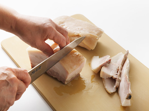 汁ごと冷まし、豚肉を4~5cm角の6個に切り分ける。切り落とした肉とゆで汁2~3カップをとっておく。 -