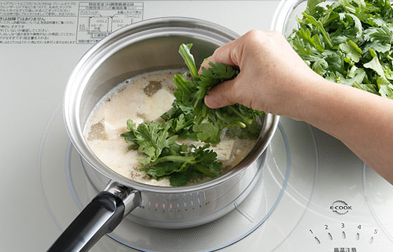 鍋にごまだし汁と豆腐を入れて【火力4】でひと煮立ちさせ、春菊を加えて2分ほど煮る。