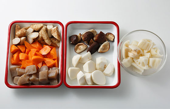 <野菜1>ごぼうはたわしなどでこすり洗いして大きめの乱切りにする。こんにゃくはスプーンでひと口大にちぎり、ゆでる。にんじんは乱切りにする。
