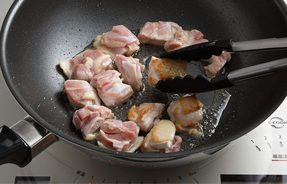中華鍋にサラダ油を入れて【予熱モード190℃】で熱し、皮を下にして鶏肉を入れる。【火力5】で脂が出てくるまで炒め、裏返して炒め、取り出す。