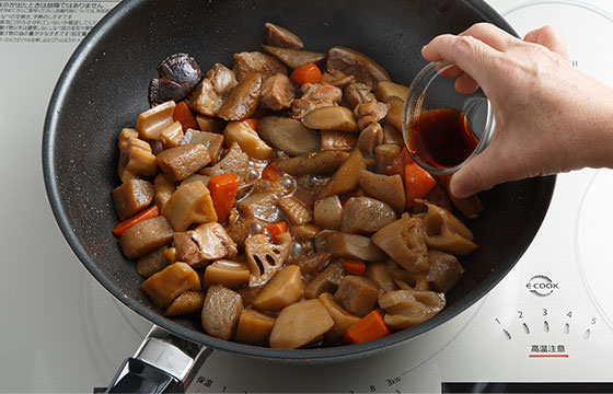 水を加えて【火力6】でひと煮立ちさせてアクを除き、煮汁調味料を加えて【火力5】にして落とし蓋をし、ときどき混ぜながら煮汁が少なくなるまで煮る。