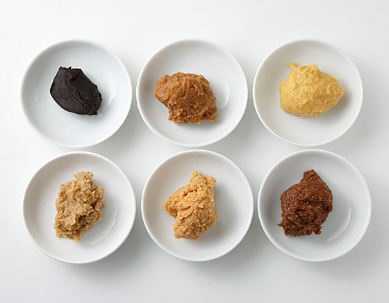 写真上段左から右に 豆みそ、信州みそ(熟成タイプ)、京都白みそ