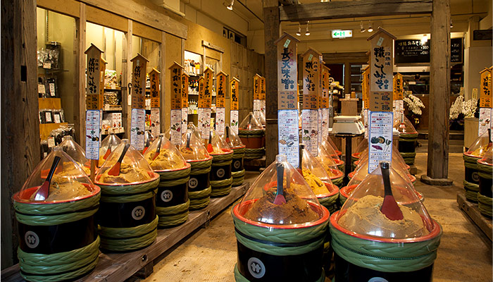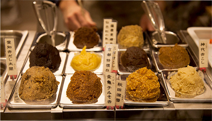 (以下 敬称略) - うちの店では、オリジナルのみその他に、全国からみそを集め、70種類ほど扱っています。みそ蔵から仕入れる蔵出しみそは、大きく分けて東と西で味が全く違います。東日本は味も色も濃く、辛口な赤みそが好まれ、西日本はどちらかというと甘くてあっさりした白みそが好まれます。その東と西の境界にあるのが信州です。ここは気候や風土も東西の中間となる平均的な環境ですので、味もバランスのよいものになっています。万人に好まれる味ですね。どれにも当てはまらないのが中京でして、真っ黒でクセのある濃い味が好まれています。