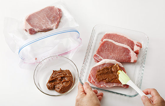 豚肉の片面にみその半量を等分して塗り、ジッパー付きのポリ袋にみその面を下にして入れる。