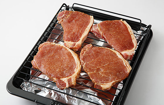 豚肉を室温に戻し、みそをきれいにふき取る。
