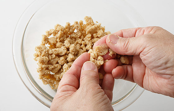 ボウルに小麦粉・ごまを混ぜ合わせ、みそを加えてゴムべらの先などで切り混ぜ、ポロポロにする。