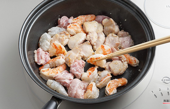 えびと鶏肉を加え、【火力5】にしてえびの色が変わるまで炒め、取り出す。