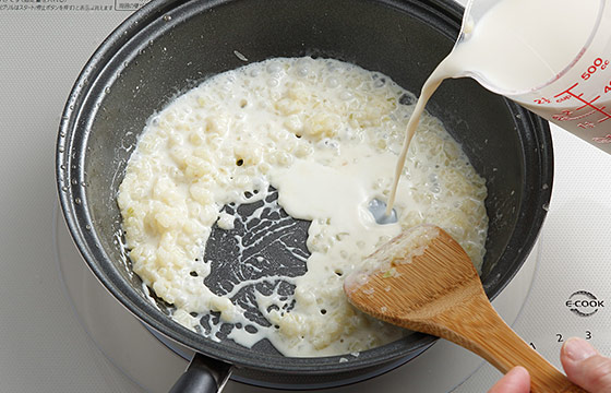 小麦粉をふり入れて炒め、みそ入り牛乳を少しずつ加えて溶きのばし、【火力5】にしてひと煮立ちさせる。