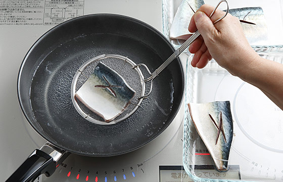 フライパンに【火力6】でたっぷりの湯を沸かし、【火力4】にしてさばを入れ、10秒ほどくぐらせて網じゃくしで取り出す。