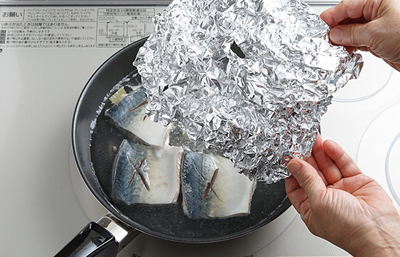 長ねぎとともにフライパンに加え、ときどきさばに煮汁をかけながら10分ほど煮る。