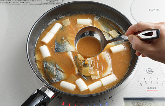 【火力4】のままで煮汁を5分ほど煮詰めてさばを戻し入れ、1分ほど煮て味をなじませる。