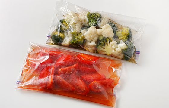 浸し汁の鍋にブロッコリーとカリフラワーを加えてペーパータオルで落とし蓋をし、【火力5】でひと煮立ちしさせて【火力3】にし、5分ほど煮る。汁ごとポリ袋に移し、空気を抜いて密封し、粗熱がとれるまで冷ます。