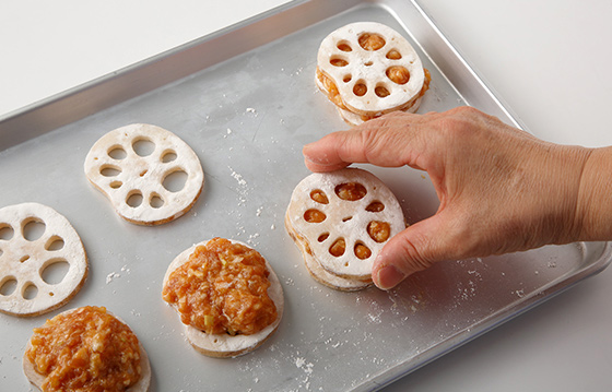 れんこんに小麦粉を薄くまぶし、半量に肉だねをのせる。