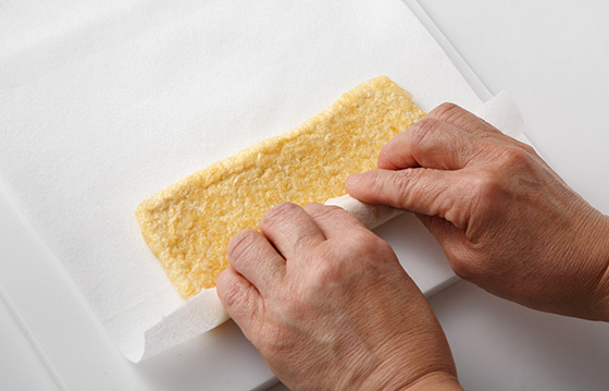 油揚げはキッチンペーパーに置いて端からきつめに巻き、強く握ってペーパーに油を吸わせる。縦半部に切り、さらに1cm幅に切る。