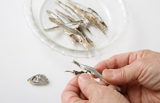 大きめの煮干しを使うときは頭と腹わたを除いて水に浸しておくと、