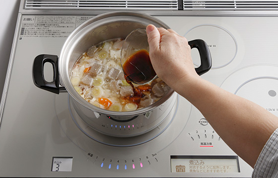 【煮込み2~3】にしてアクを除きながら5分ほど煮、調味料を加えて野菜がやわらかくなるまで10分ほど煮る。