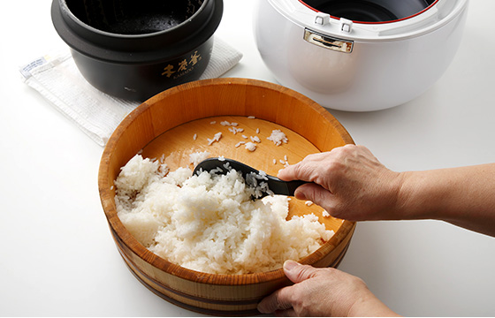 酢水でしぼった布巾で盤台をふき、炊き上がったご飯を一度に移す。