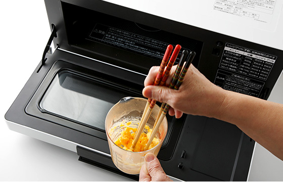 ラップをかけ、電子レンジ【500W】で30秒加熱し、菜箸3~4本で手早くかき混ぜる。