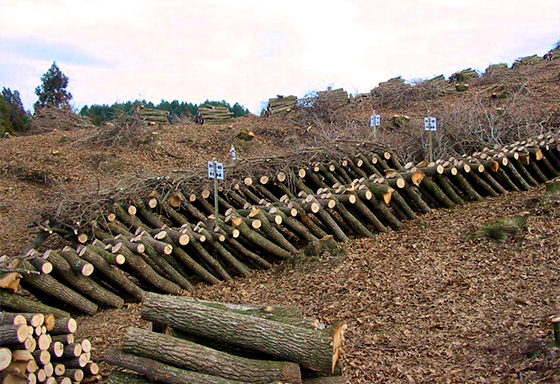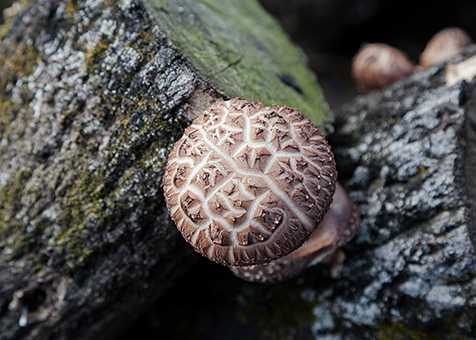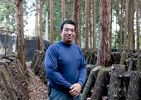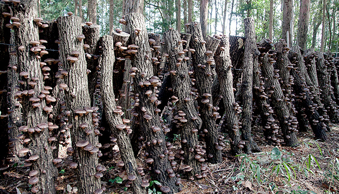 - 菌糸を原木全体にまんべんなく行き渡らせるために、それくらいの期間が必要なのです。その後、「ほだ場(ば)」という、しいたけの発生に適した環境に移します。「駒打ち」から1年半後の翌年の秋に最初のしいたけが採れ、それから毎年春と秋に採取できるようになります。ひとつの原木からだいたい3~4年間、しいたけが採れますね。