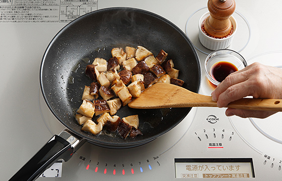 【火力6】にしてしいたけを加え、焦げ目がつくまで炒める。火を止め、しょうゆを加えてからめ、こしょうをふる。