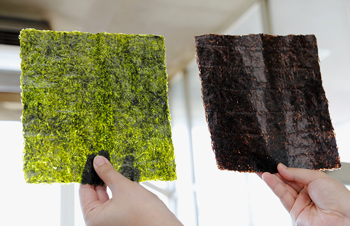 右が焼く前、左が焼き上げた後。完全に水分が抜けた海苔は、焼き方によっては焦げにもつながりかねない繊細なもの。しかも天候や気温、湿度に海苔の状態などは無限に変わります。熟練の職人だからこそ、試し焼きは欠かしません。最適な温度と時間を微細に調整してから、本番の焼きに入ります。