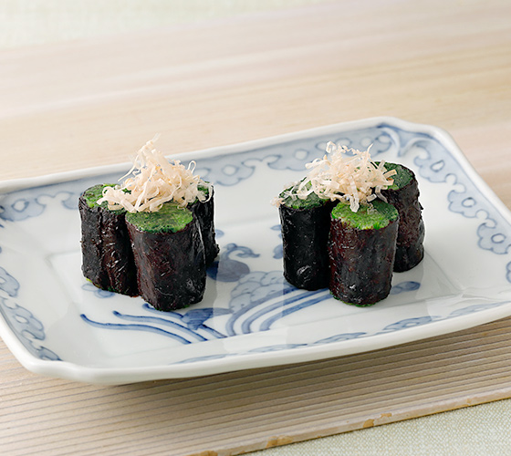 昔、海苔といえば「乾(ほし)海苔」が当たり前。ツルツルしている表面を内側にして2枚を重ね、焦がさないように炙ってから食べたものでした。色が黒いため黒海苔とも呼ばれ、磯の香りが強いのが特徴です。関西では今でも、巻きずしを作るときに乾海苔を焼かずにそのまま使うこともあります。