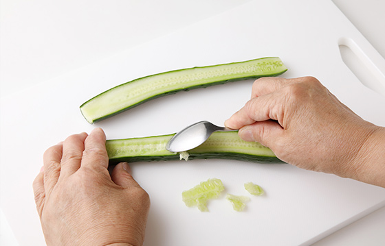 きゅうりは縦半分に切ってスプーンで種を除き、1cm幅の斜め切りにする。