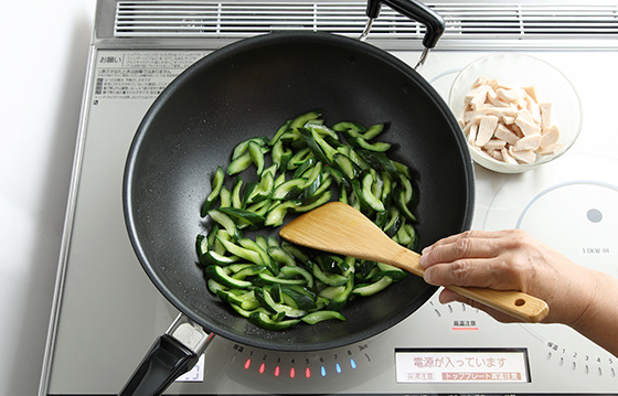 中華鍋を【予熱モード190℃】で熱し、【火力5】にしてサラダ油を熱し、きゅうりと赤唐辛子を炒める。