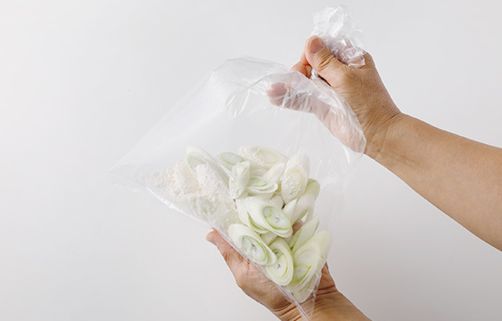 長ねぎとえびを合わせ、揚げる直前にポリ袋に入れて天ぷら粉大さじ1をふり入れ、空気を入れて口を閉じ、ふり混ぜて粉をまぶし、8等分する。