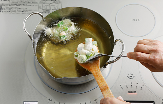 170℃の揚げ油にすべり落とし、途中で裏返しながらねぎの縁が色づくまで揚げる。