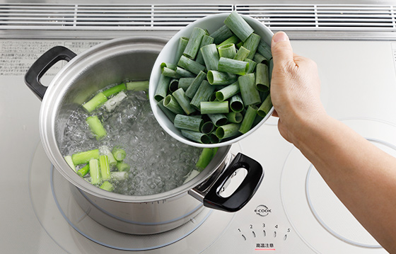 【火力6】で湯を沸かし、白い部分を入れて30秒ほどゆで、葉を入れて色が鮮やかになる程度にさっとゆでる。