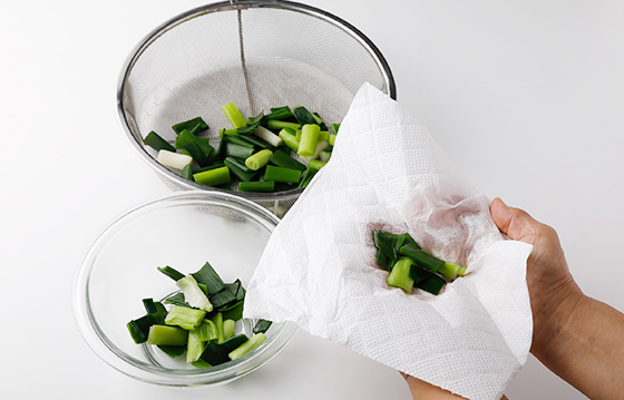 青ねぎは、適量ずつキッチンペーパーに包んで握り、水気を絞る。