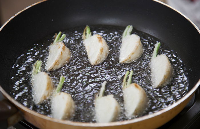 - いえ、ご自身でやるんですよ(笑)。まずかぶをくし型に切って、片栗粉をつける。そしてフライパンに多めの油を入れて……。そうそう。もっと入れて大丈夫。片栗粉って低温で調理すると油に流れ出てしまうんです。食材に粉がきちんとついた状態で油の中で固まるように揚げたいですね。だから一定以上の量の油を入れること、そして最初からきちんと油温を上げておくことが大切なんです。
